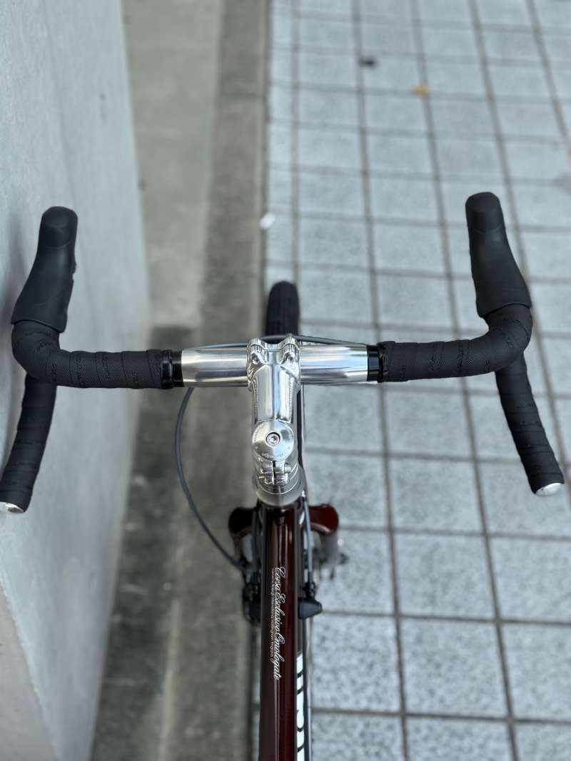 流行のグラベルハンドル。上部が狭く、下部が広くなっています。見た目もカッコいですね!個人的にはやや不安定かなぁとちょっと乗りにくく感じています。ノーマルハンドルへ交換もできるのでご相談ください!