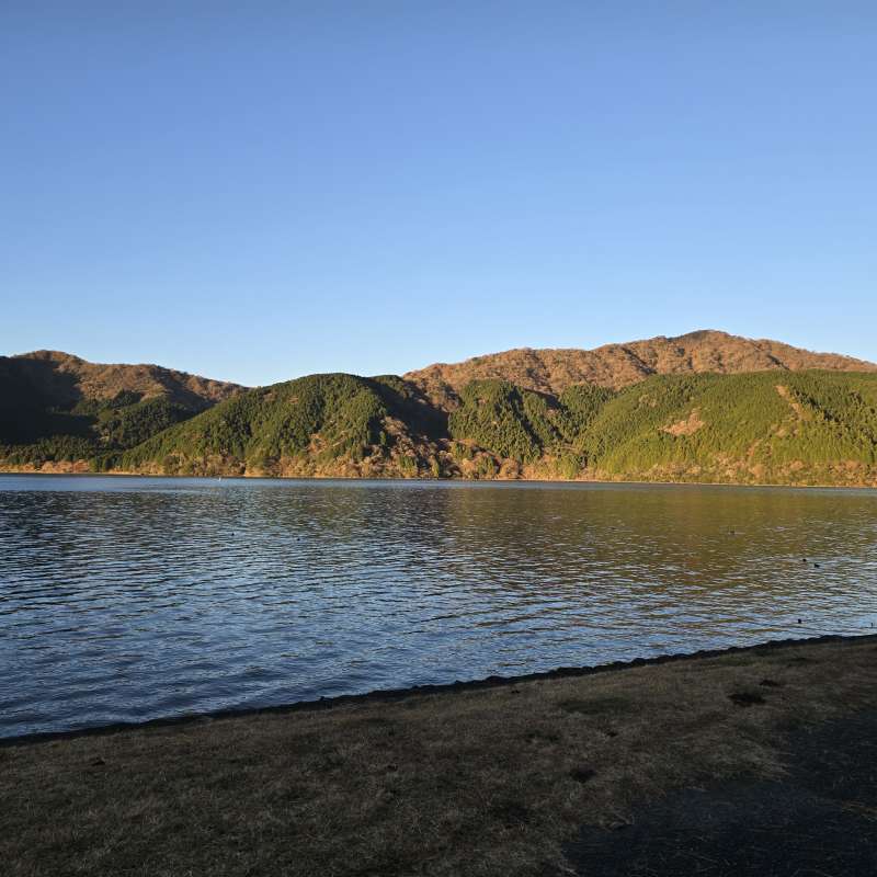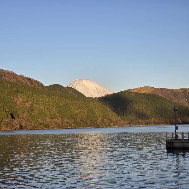 食後の満足感と朝の静寂に包まれた芦ノ湖、山間から顔を出す富士山。