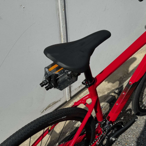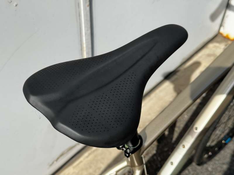前傾姿勢がキツすぎないアップライトなポジションと、アルミ特有の「硬さ」を抑えたフレーム設計(形状)と幅広肉厚サドルで、初めてのロードバイクでも長距離を楽しく走りきることができます。
