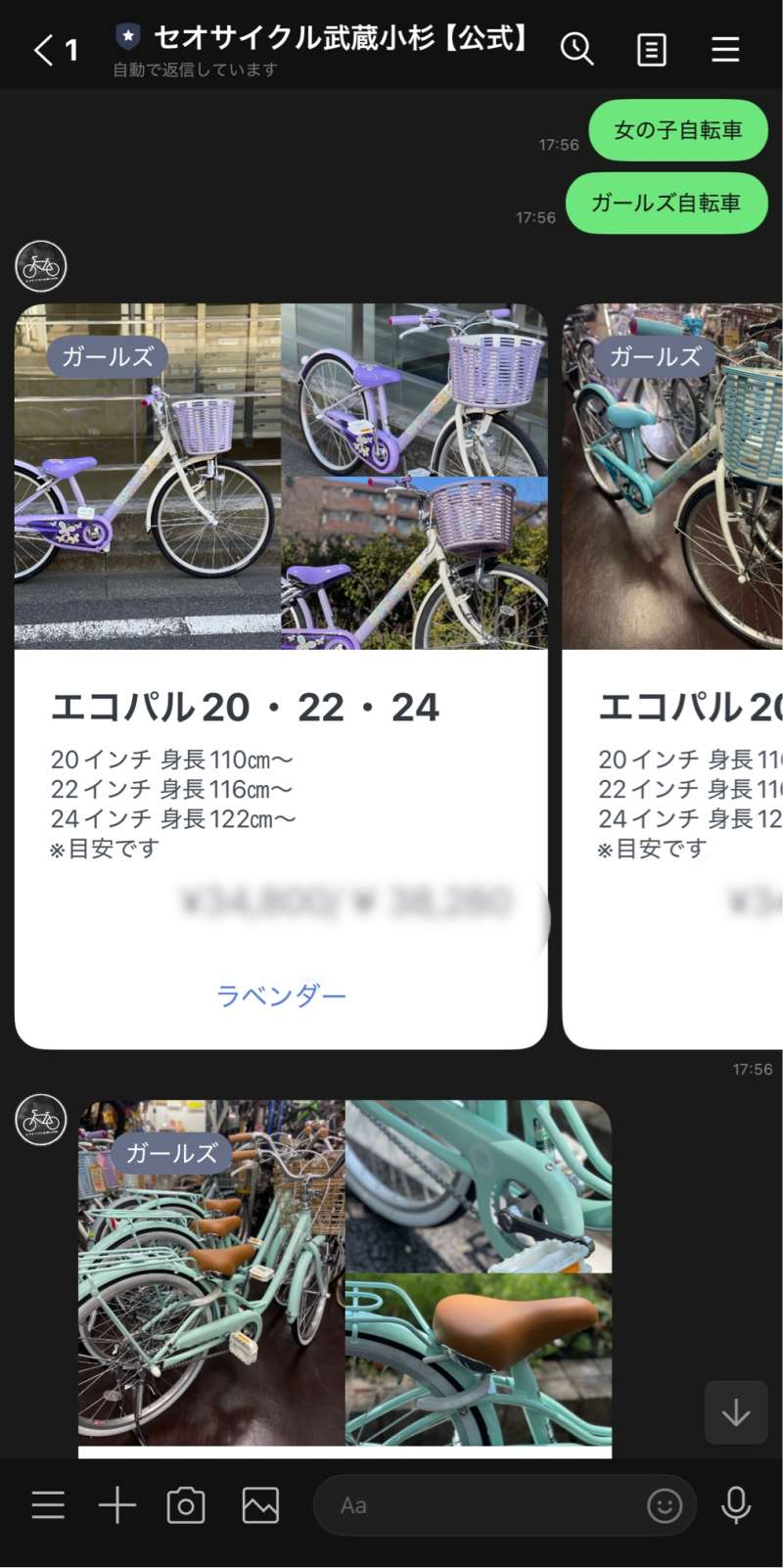 当店の公式LINEからワタクシ店長上野が『自分の子供にこれなら安全に乗せられる!』という基準で仕入れた、ガールズ向け自転車の在庫と販売価格、カラーを見られるように致しました!