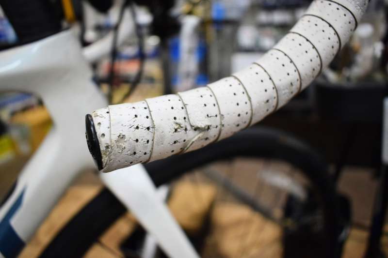 バーテープやサドルも劣化が進んでいます。ホワイトのカラーは見た目が明るく良いのですがサドルなどは日焼けにより黄ばむのを考慮しないとですね。
