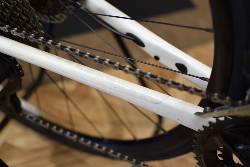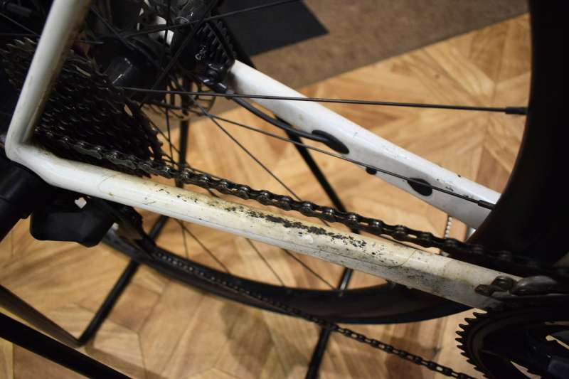 フレームにも無数の小傷が入っています。塗装面に何かを擦ったりするとクリアの表面が荒れてその中に汚れが入り込みます。ホワイトは特に目立ちますね。