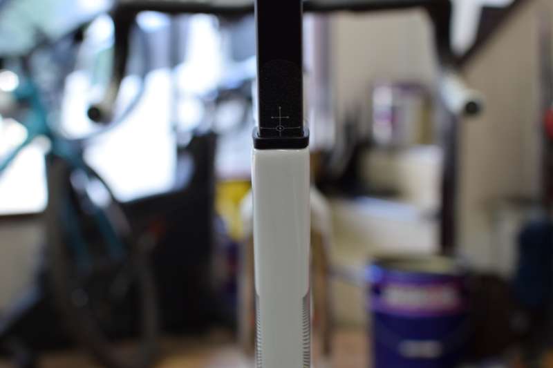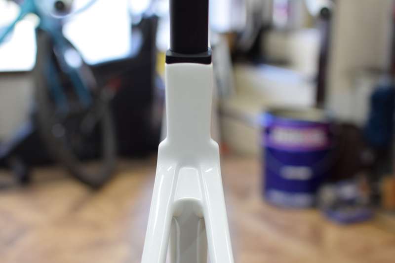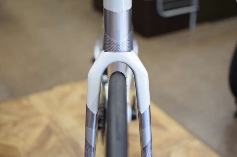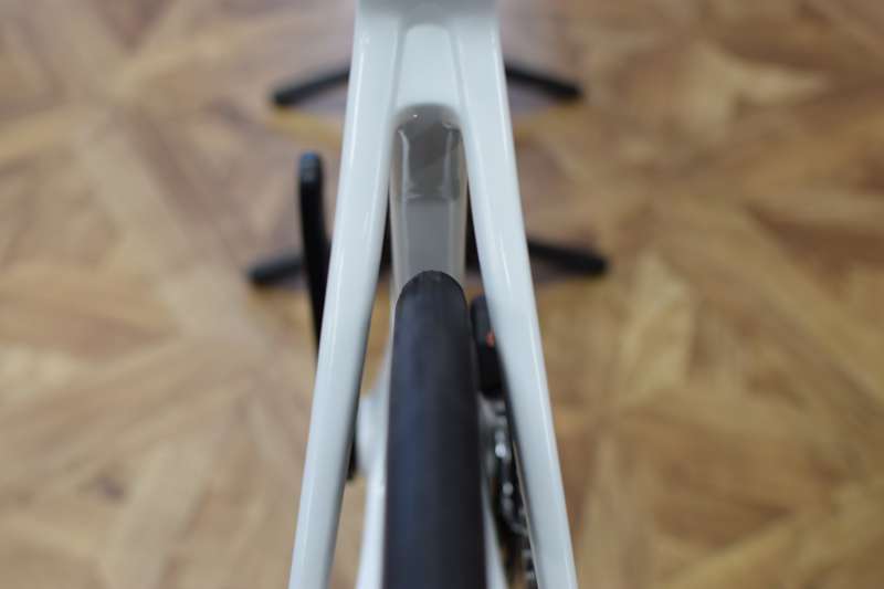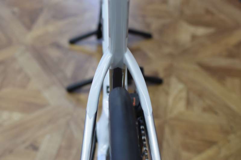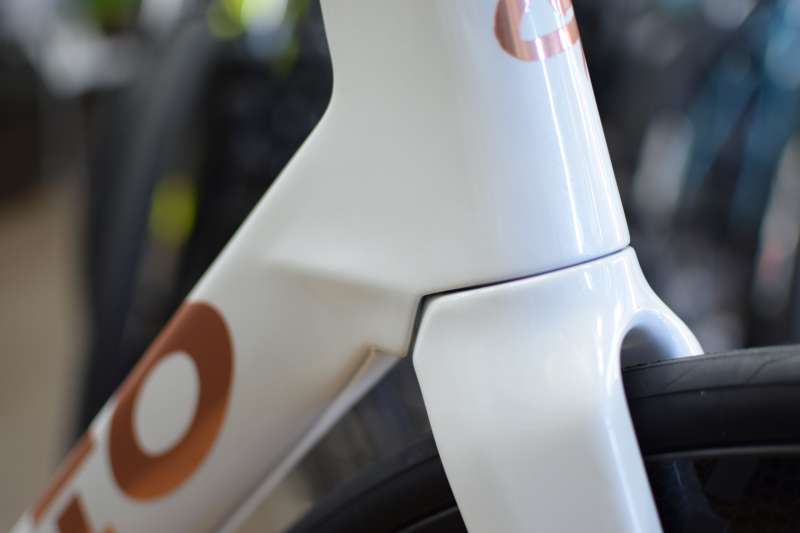フロントフォークとフレームの勘合部分は大きく隙間が空いています。この形状が空力にかなり効果があるそうです。他ブランドも多く採用しています。