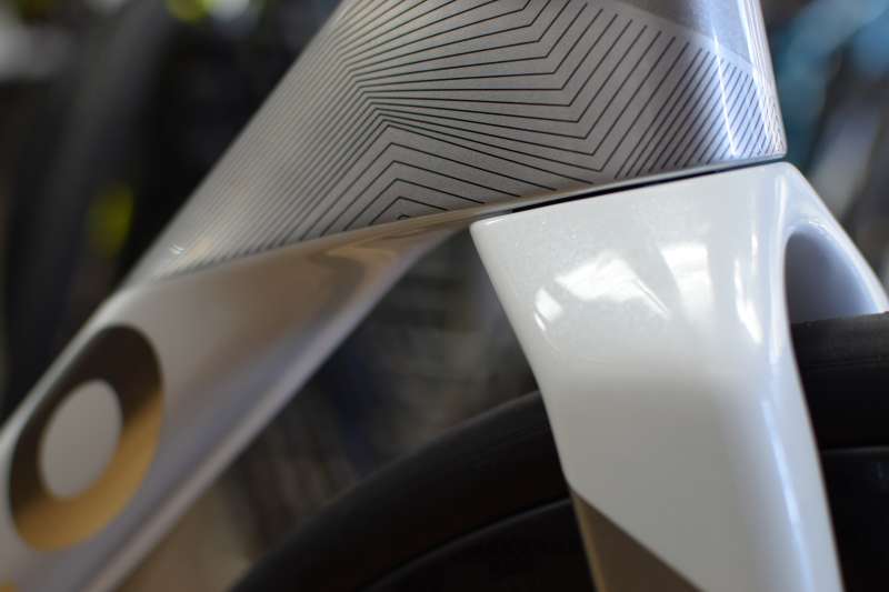 大きく変わったのがフレーム形状です。現在のレースシーンのトレンドに合わせかなりの進化を遂げています。ヘッドチューブは剛性感高そうなマッシブな形状ながら空気抵抗も軽減しています。