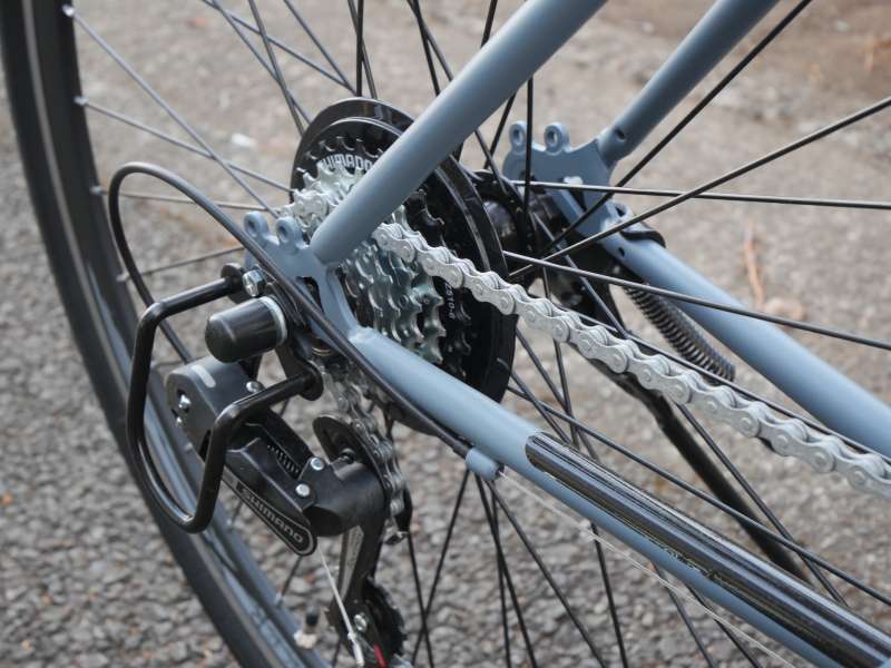 また、変速機を転倒時の衝撃から保護するディレイラーガードを標準装備しています。駐輪中の転倒などによる変速機周辺の破損を軽減する役割があり、通勤・通学用途では実用性の高い装備です。