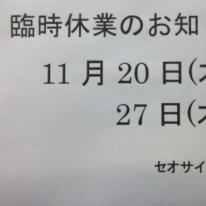 誠に勝手ながら11月6日13日20日27日(木)を臨時休業とさせていただきます。