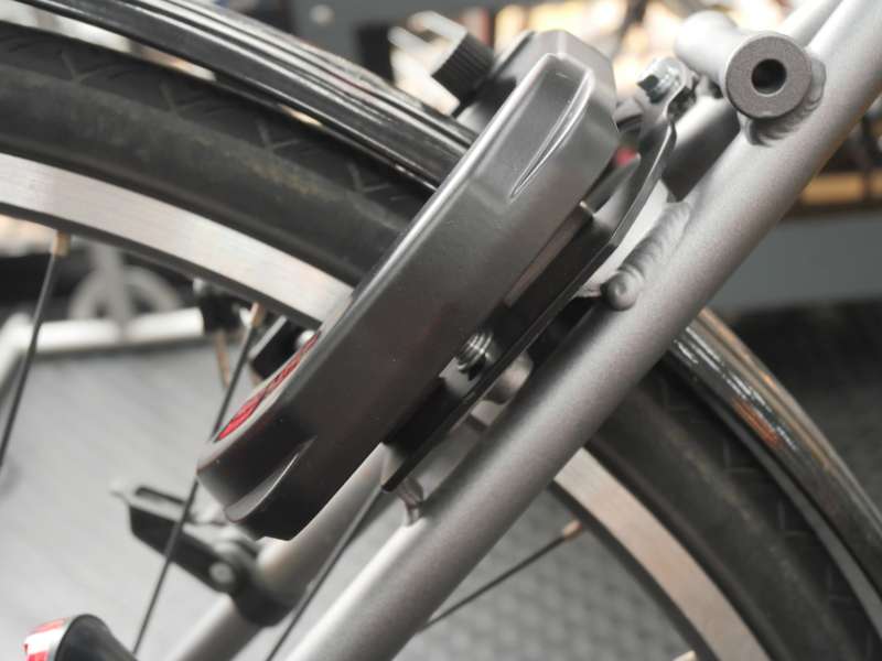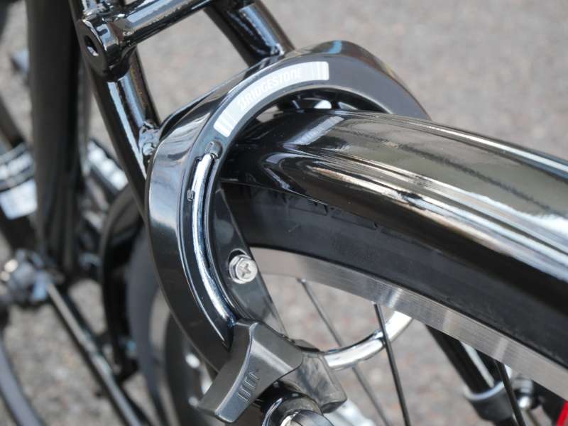 TB1に付いているVブレーキはクロスバイクで多く採用されていて、少ない力でも強力にブレーキをかけることができます。前側にはパワーモジュレーターが搭載されており、過剰なブレーキングパワーを逃がすことで前輪がロックしにくいようになっています。ただし、ブレーキの制動力が高い反面「キーッ」という音鳴りが出やすいのも特徴です。