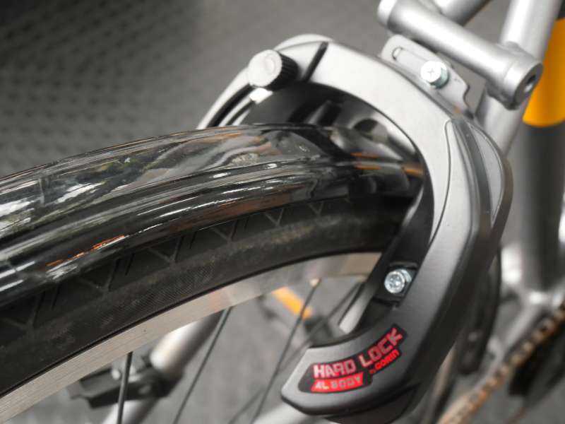 TB1のサークルロック取付部の形状は、ブリヂストン製電動アシスト自転車と同等の仕様となっています。今回使用した「GORIN GR972e」は電動アシスト自転車専用のリング錠で、クリアランスはギリギリではありますが、問題なく装着することができました。